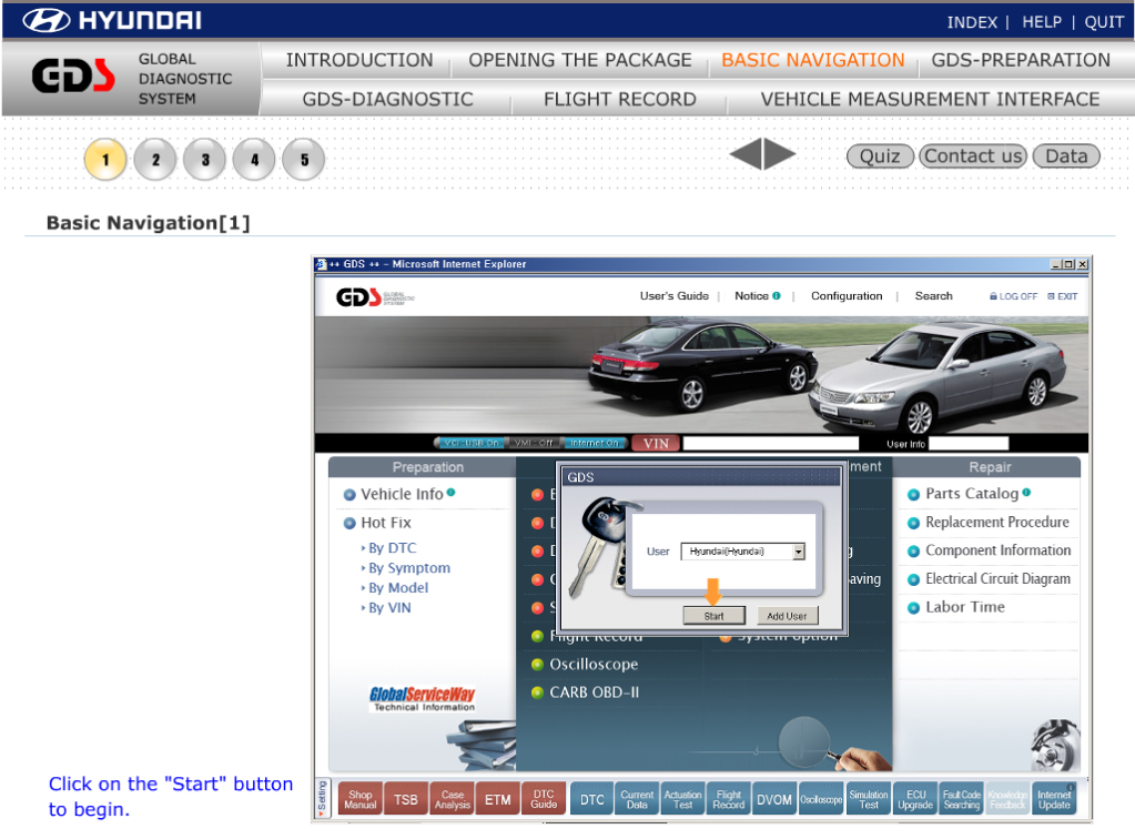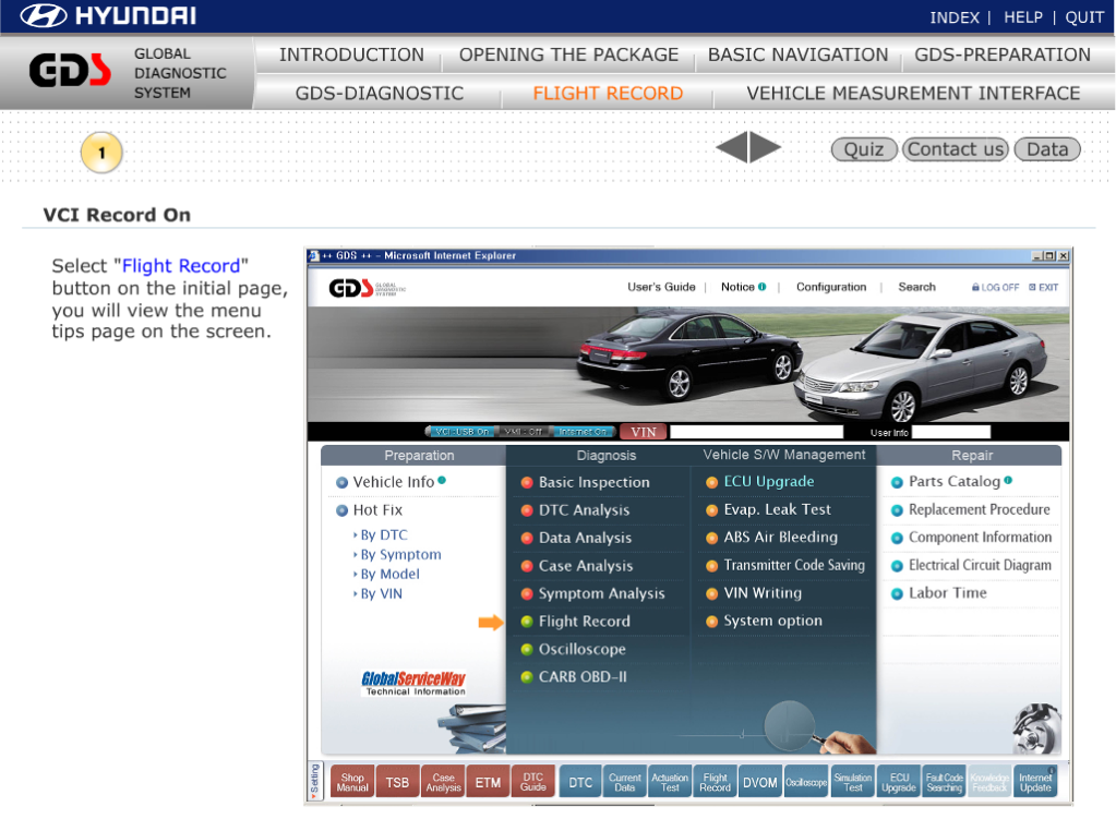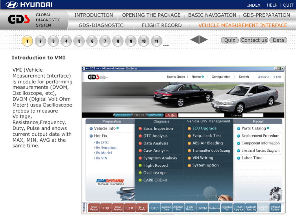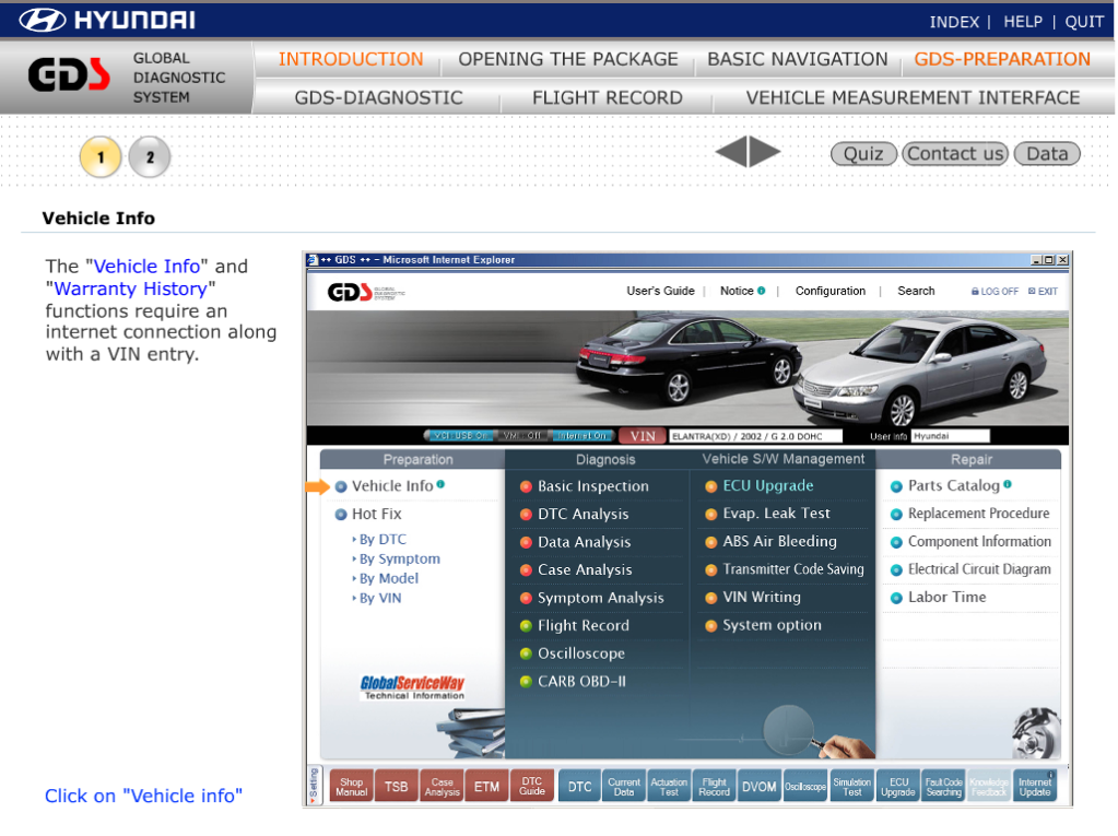 Tài liệu hướng dẫn sử dụng phần mềm chẩn đoán Global Diagnostic System - GDS của Hyundai mô phỏng bằng Flash rất trực quan, sinh động. Hướng dẫn thao tác như trên thực tế.