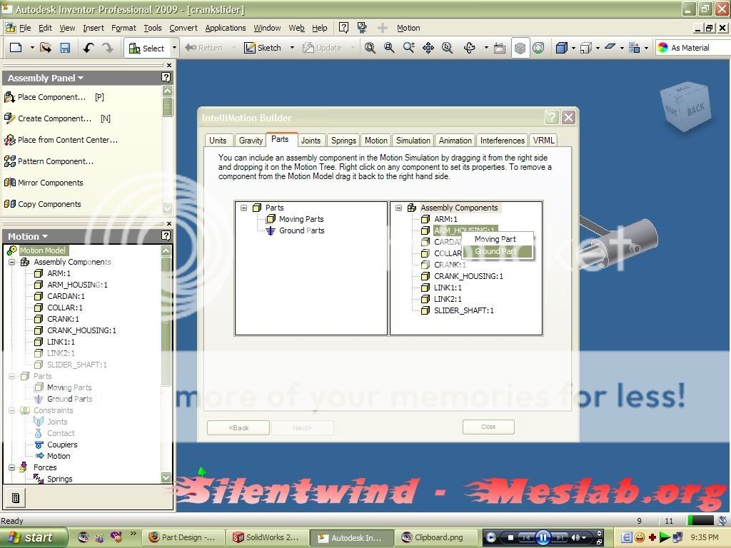 - Với Tab Part cho phép ta định nghĩa các khâu. Right click lên khâu ARM_HOUSING và chọn Ground Part để định nghĩa khâu đó là khâu giá.