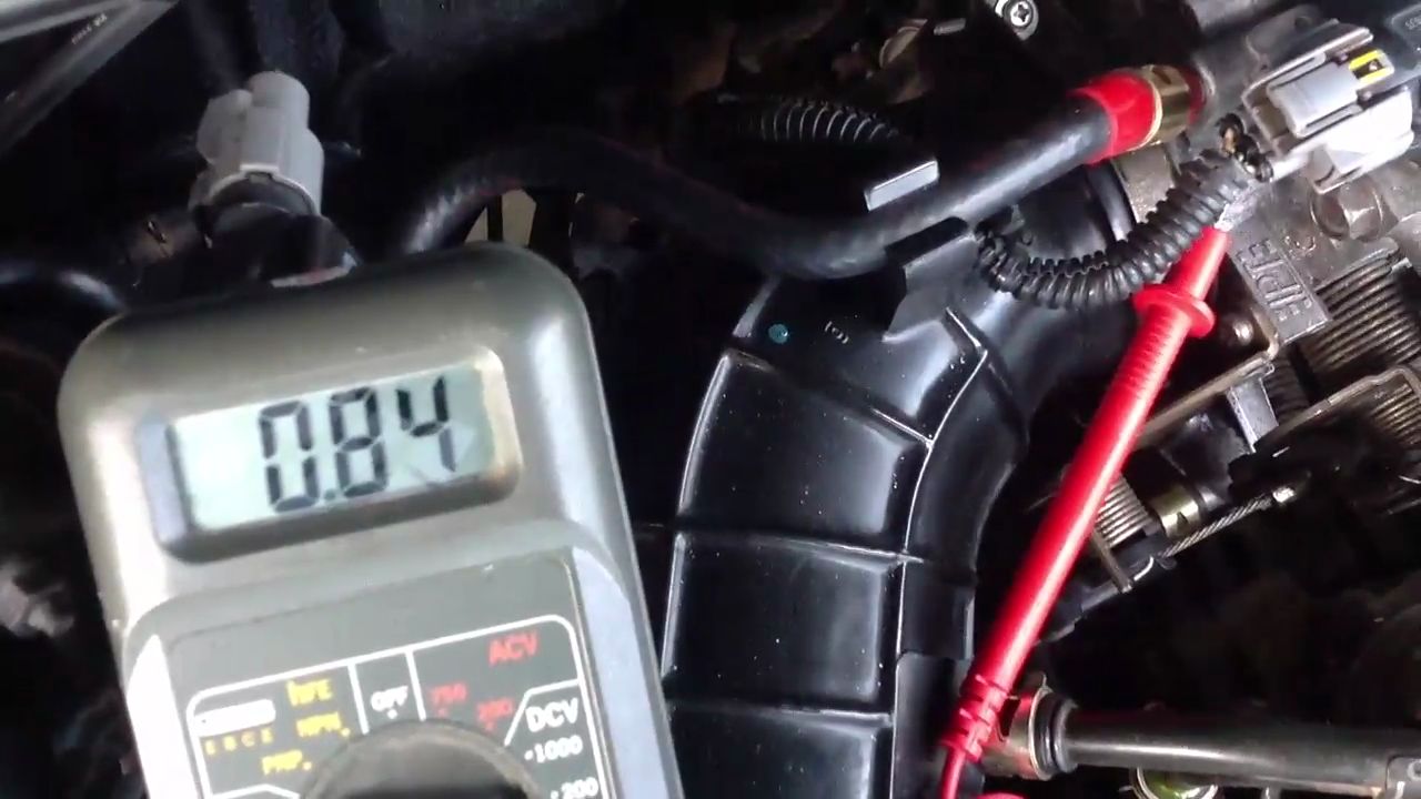 Nối cọc + của đồng hồ với cọng dây bên phải của giắc cắm nếu nhìn từ đuôi giắc vào cảm biến, cọc - của đồng hồ với cọng dây chính giữa hoặc vào cọc mát Bình điện hoặc bất kỳ chổ nào tiếp mát trên máy, bật chìa khoá điện ON, đo được 2,9V khi máy DỪNG (Tiêu chuẩn 2,6 - 3,0V):
