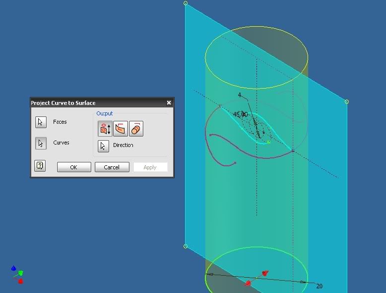 Sau đó tạo workplane qua tâm mặt trụ và vẽ 1 sketch như hình dưới. Mục đích là chiếu hai đường spline này lên mặt trụ để tạo đường cong 3D.