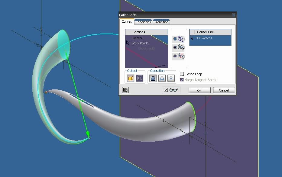 Dùng lệnh Loft tạo khối từ sketch trên và workpoint ở cuối đường cong như hình vẽ ta