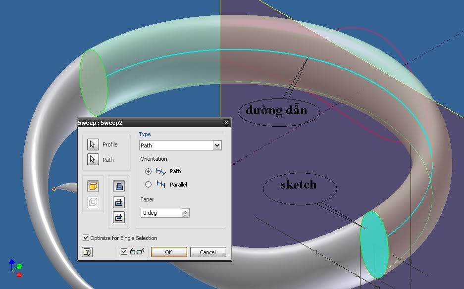 Dùng lệnh sweep với biên dạng đã có, đường dẫn là nửa cung tròn còn lại.